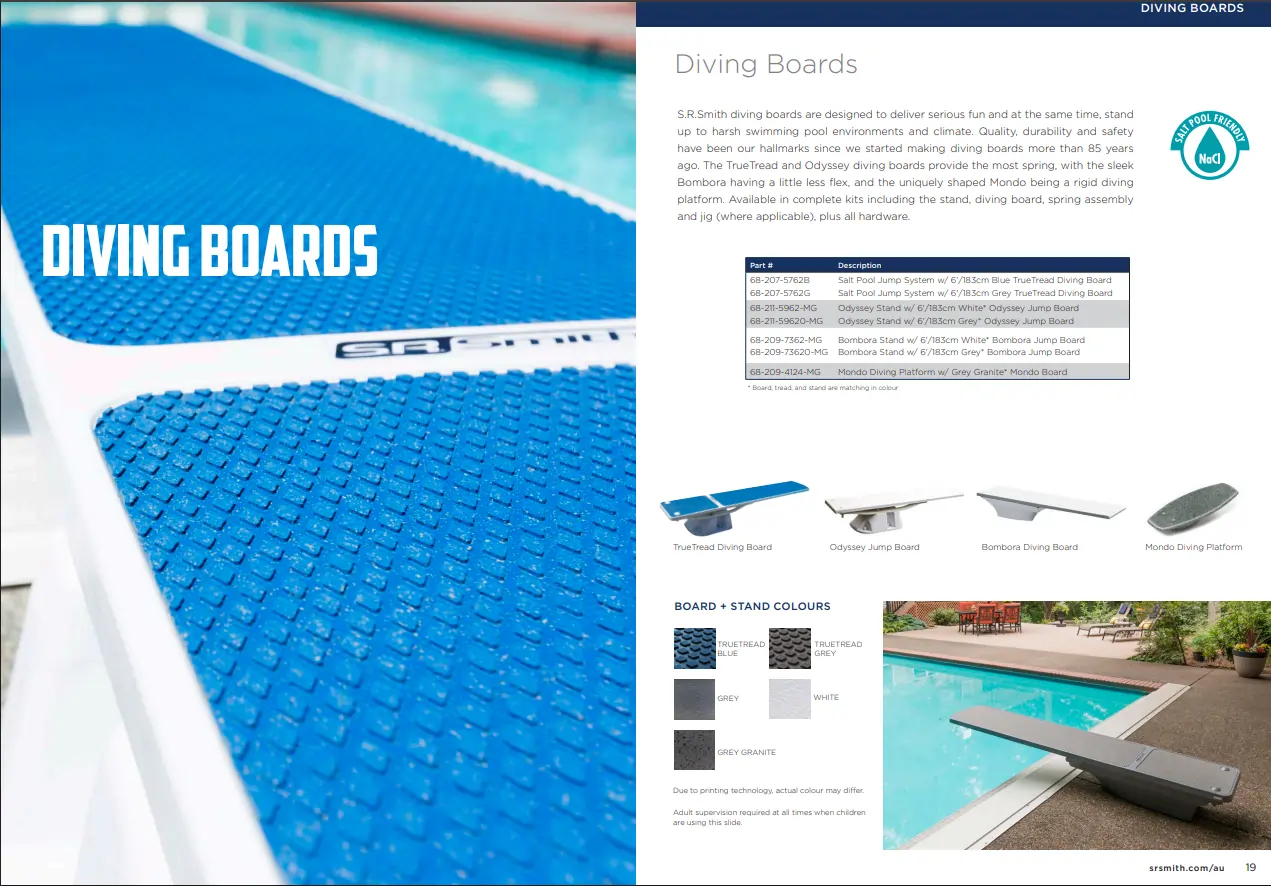 up to harsh swimming pool environments and climate. Quality, durability and safety have been our hallmarks since we started making diving boards more than 85 years ago. The TrueTread and Odyssey diving boards provide the most spring, with the sleek Bombora having a little less flex, and the uniquely shaped Mondo being a rigid diving platform. Available in complete kits including the stand, diving board, spring assembly and jig (where applicable), plus all hardware.