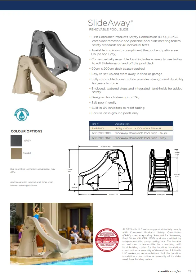 • First Consumer Products Safety Commission (CPSC) CPSC compliant removable and portable pool slide,meeting federal safety standards for 48 individual tests